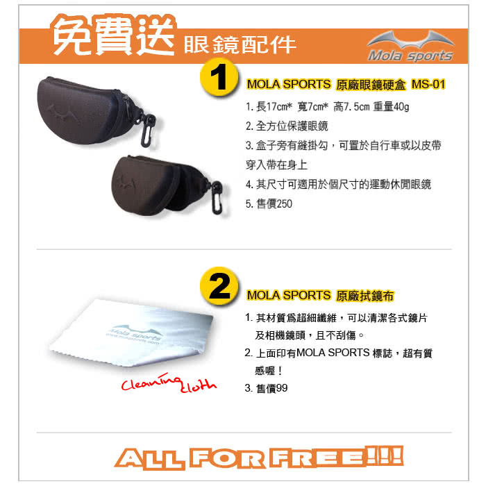 1年保固期保固服務 1.Mola Sports產品自購買日起,提供一年售後服務保證. 2.保固期間內,在正常使用情形下發生故障時,請將完整商品連同本保證卡寄回Mola Sports公司,享保固維修服務. 3.保固期間內,若因不正常使用導致產品故障或受損時,可依原價75%向公司申請同色同款Mola Sports運動太陽眼鏡乙付(壹次為限).遇產品停產時,公司有權保留更售其他等值商品. 4.本保證僅保證Mola Sports產品本身,不包含其他任何形式之附件或贈品之保證. |